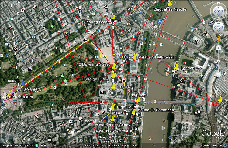 Leaving Buckingham Palace (Main Penta Arm) the route travels with the Mall ( Main Penta line) before turning into Guards Square hitting the line bisecting the N/W Penta Arm.
